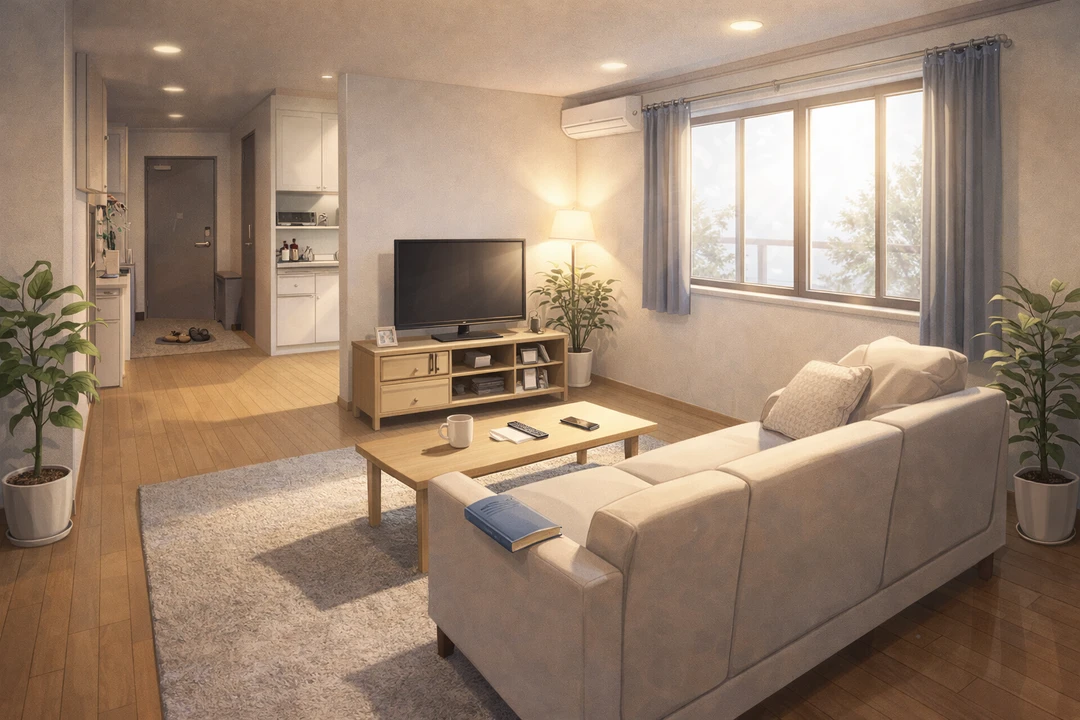 현관을 열면 바로 이어지는 거실, 벽 한쪽엔 소파와 작은 테이블, 창가에는 햇빛이 부드럽게 들어온다.