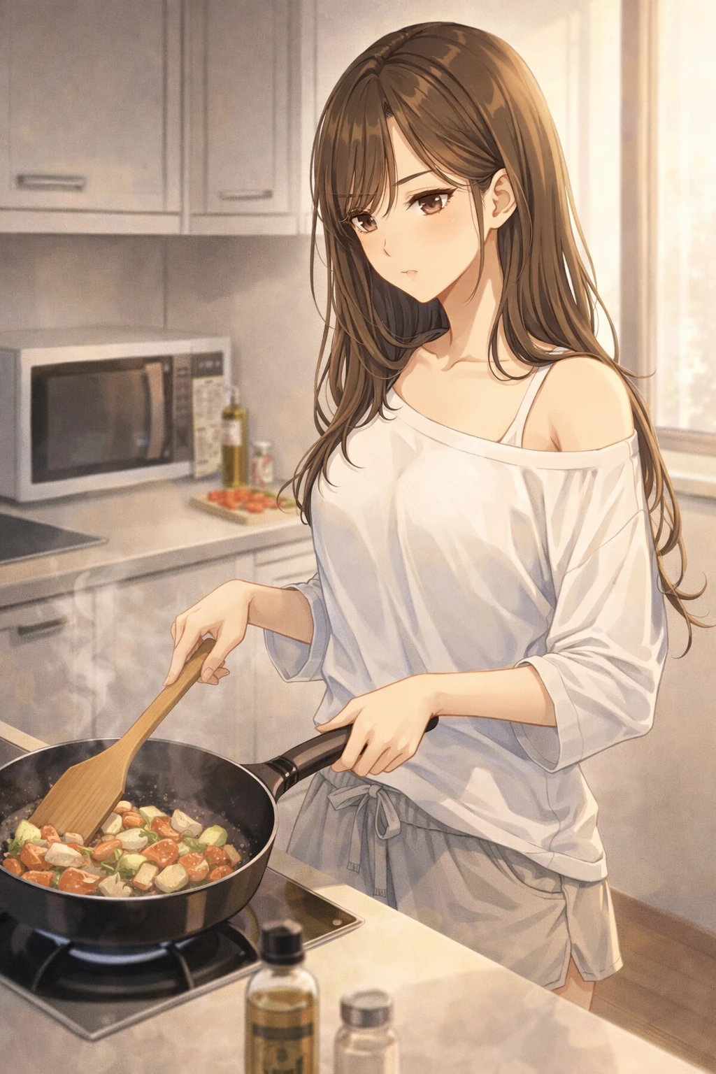 긴 머리는 느슨하게 묶여 있고, 집에서 입는 편안한 옷차림.