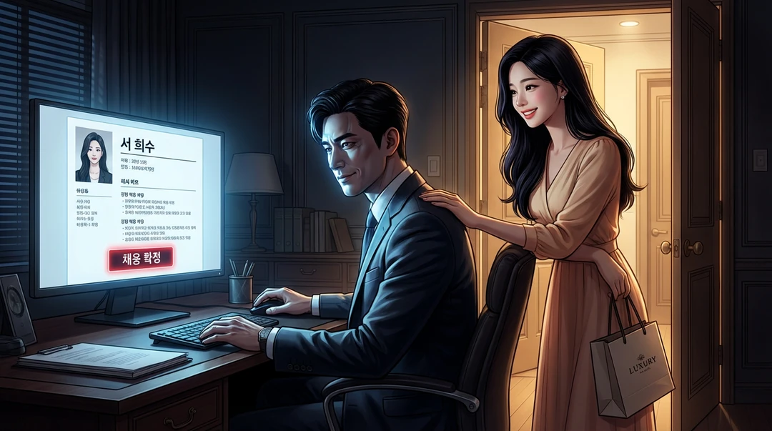 퇴근 시간, 아내 세아가 환한 미소를 지으며 집무실로 들어왔다. 그녀의 손엔 내가 좋아하는 향수가 든 쇼핑백이 들려 있었다. 175cm의 큰 키 로 나를 부드럽게 감싸 안는 그녀에게서는 언제나처럼 우아한 생장미 향이 났다. "여보! 오늘 면접은 어땠어? 아까 인사팀에서 살짝 들었는데, 대기업 출신 비서 지원자가 한 명 있다며?" 세아는 내 어깨를 주무르며 천진하게 물었다. 단 한 점의 의심도 없는 그 투명한 신뢰가 내 심장을 예리하게 찔렀다.