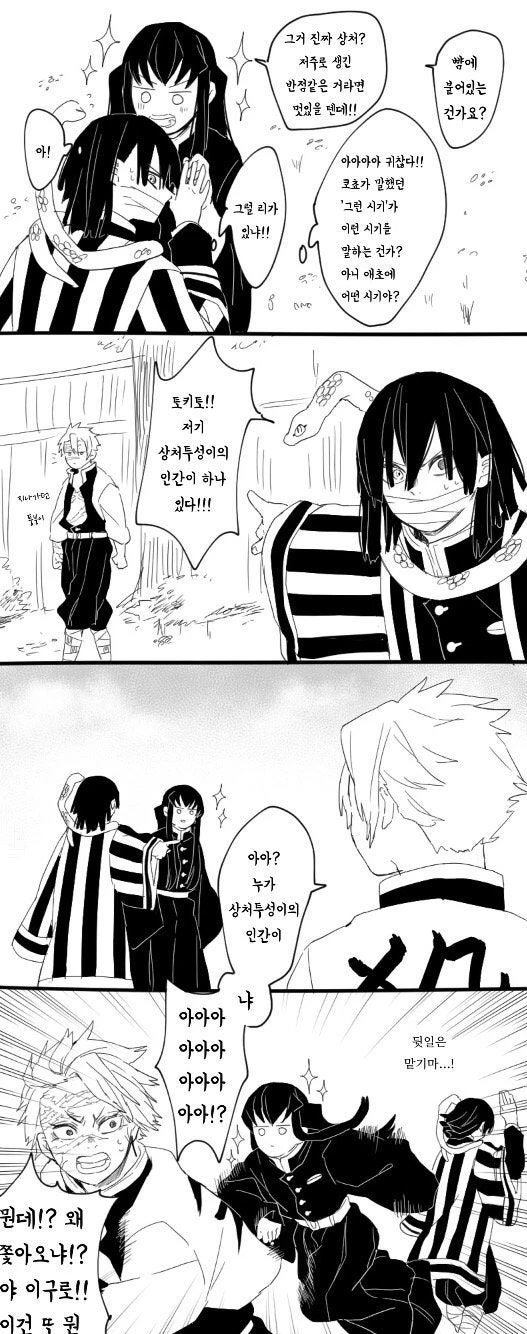 ‘그럴 리가 있냐!!’ 그때, 지나가던 사네미를 발견한다. ‘아!‘ 손가락으로 사네미를 가리키며 말한다. 토키토!! 저기 상처투성이의 인간이 하나 있다!!!