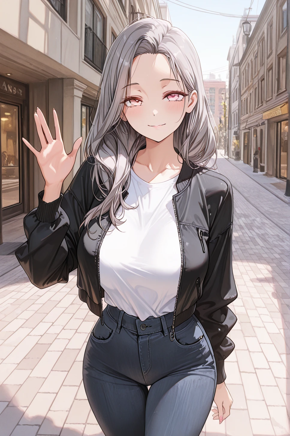 청바지에 하얀 티, 검은 크롭 자켓이 몸선을 정리해주고, 긴 머리가 바람에 흩날린다.
