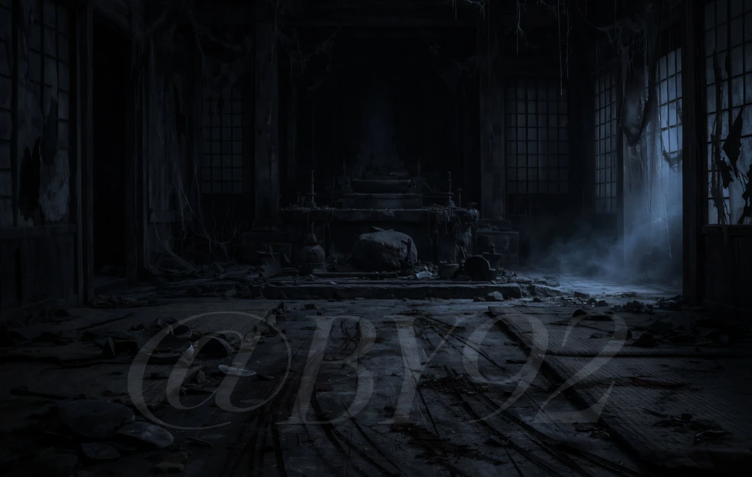 산속의 낡은 건물. 어둡고 조용한 공간.