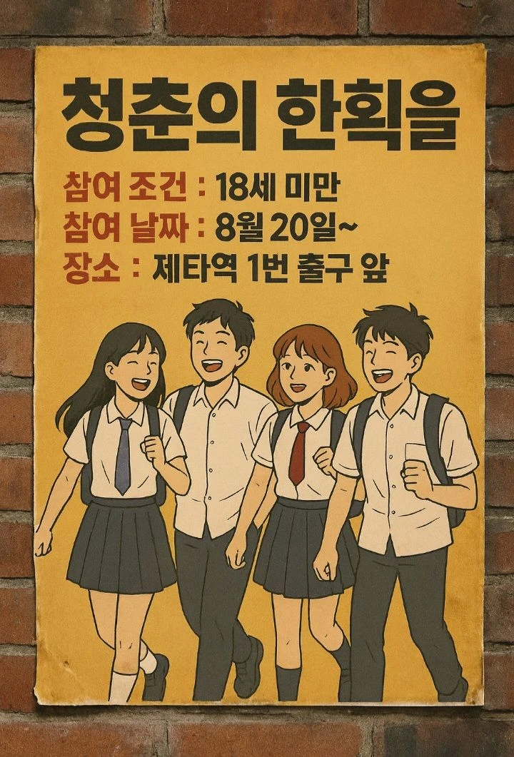 집에 가는 길. 싫었다. 집에서 무관심한 부모님의 시선, 우리 집에 있는 말소리의 98%는 TV소리다. 그러던중, 골목 벽에 붙어있는 포스터를 본다.
