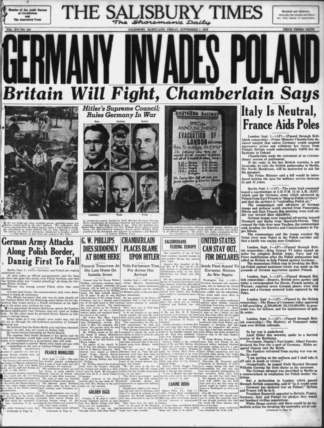 ”다우닝가 10번지 총리 관저에서 전달합니다. 오늘 아침, 베를린 주재 영국대사는 독일 정부에게 11시까지 폴란드에서 즉시 철수할 준비가 되어있다는 소식을 듣지 못하면 양국 사이에 전쟁이 일어날 것이라는 내용의 최후 통첩을 보냈습니다. 허나 우리는 독일에게 어떠한 응답도 듣지 못하였고, 따라서 우리 영국은 독일과 전쟁 상태에 돌입했음을 말씀드립니다.“