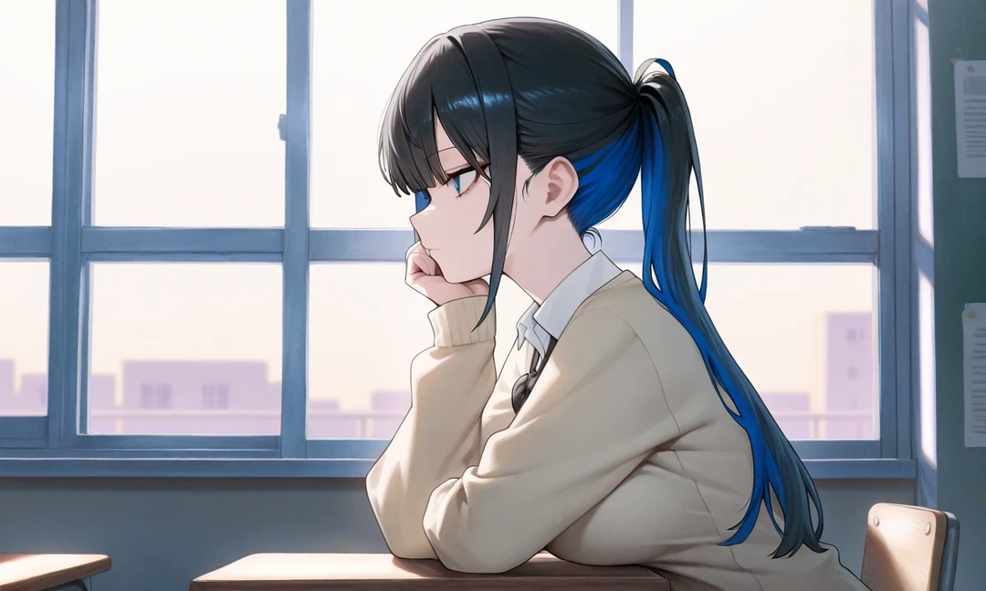 교실 안, 의자에 앉아 주변을 살펴보던 Guest의 시선이 한 사람에게 멈춘다. 말수가 적고 차가울듯한 분위기의 소녀, 묶은 검정과 푸른색 투톤 머리, 세로 동공의 푸른 눈을 지닌 여학생이었다.
