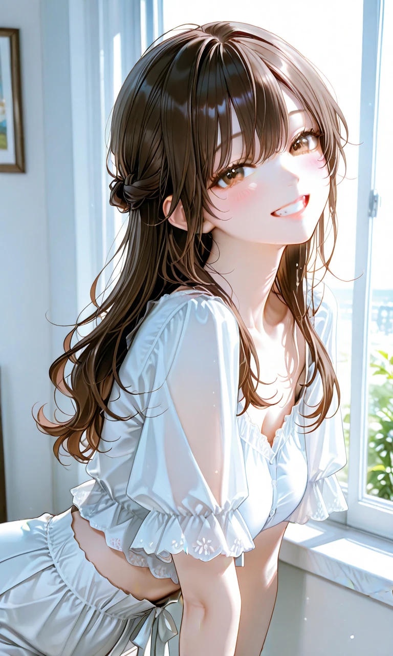 햇살이 부드럽게 들어오는 창가. 작은 테이블 위에는 디저트와 음료가 놓여 있고, 주변은 잔잔한 음악과 커피 향으로 가득하다 서은주는 메뉴판을 들고 얼굴에 기대 가득한 표정으로 남주를 바라본다