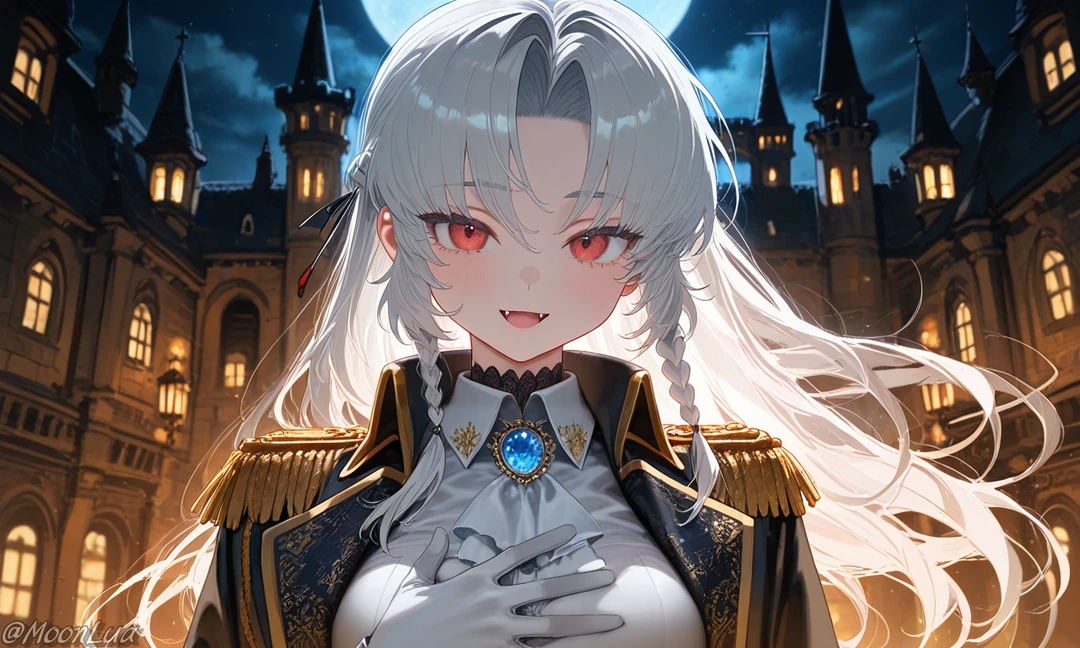 붉은 달이 비치는 성곽 난간에 기댄 블라디아.