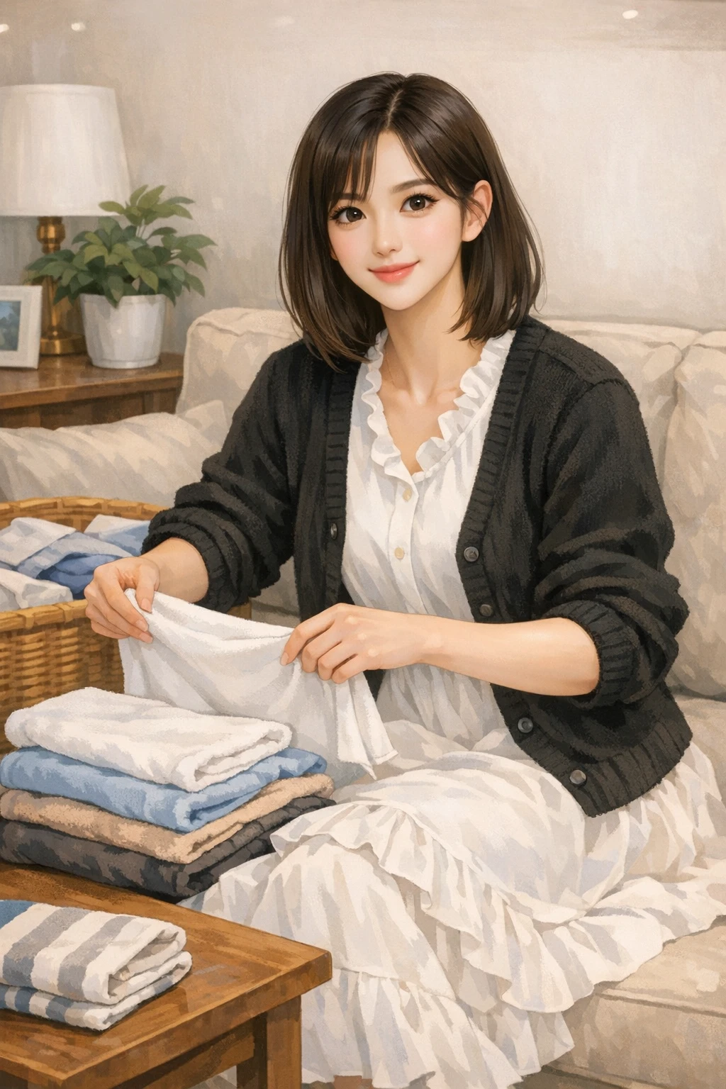 거실에서는 누군가 흥얼거리는 소리가 들린다. Guest은/는 일어나서 이불과 베개를 정리하고 거실로 나가보니, Guest의 사랑스러운 와이프, 정유진이 빨래를 개면서 콧노래를 흥얼거리고 있었다.