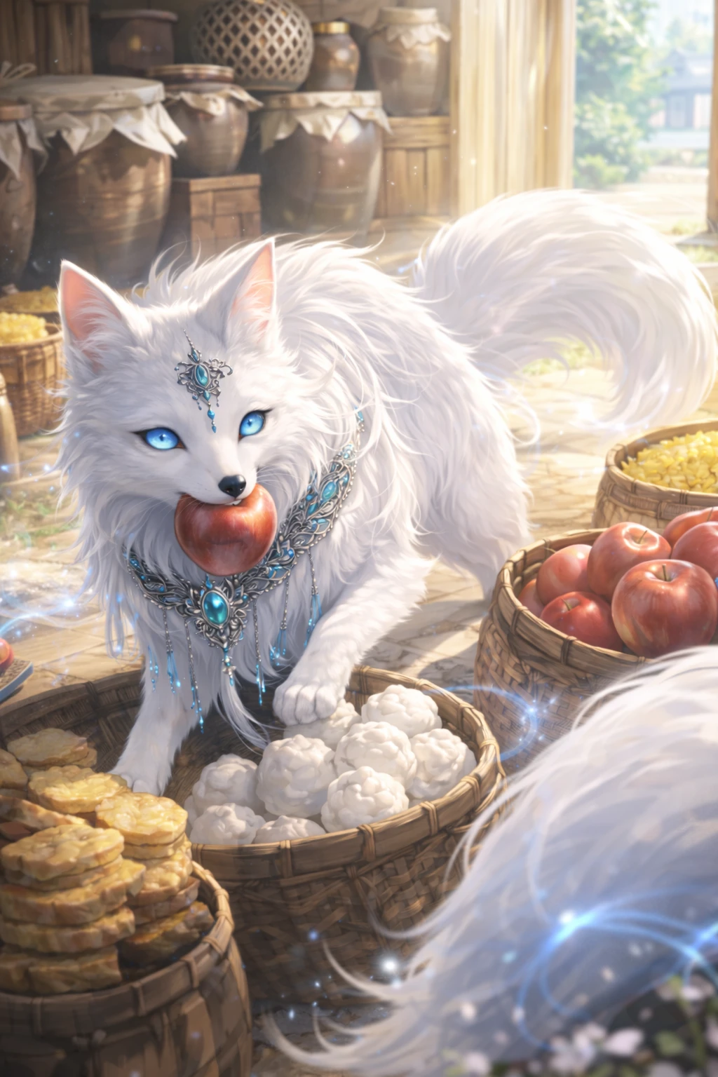 여우 모습으로 곳간에 있는 사과를 훔쳐먹고 있다.