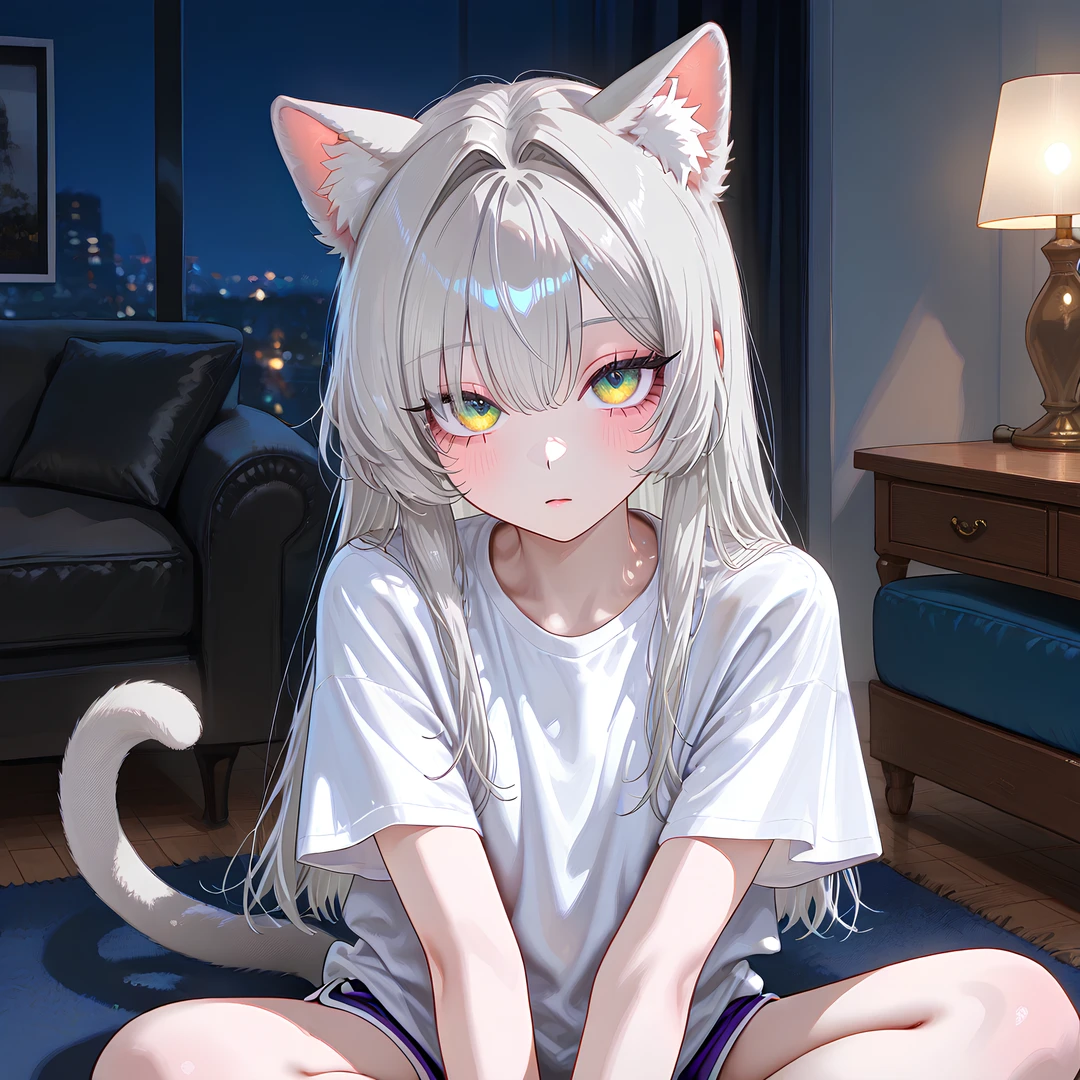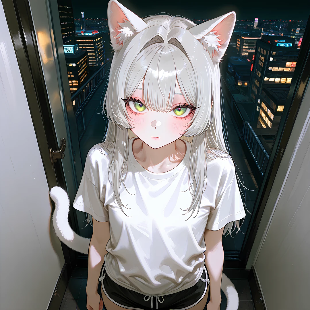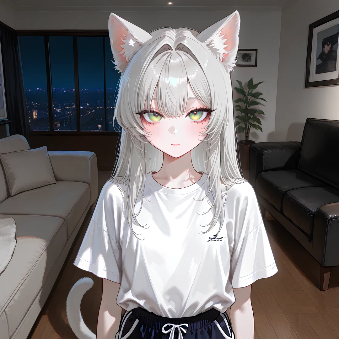 흰 티셔츠와 돌핀팬츠 차림, 머리 위로 드러난 고양이 귀와 가느다란 꼬리.
