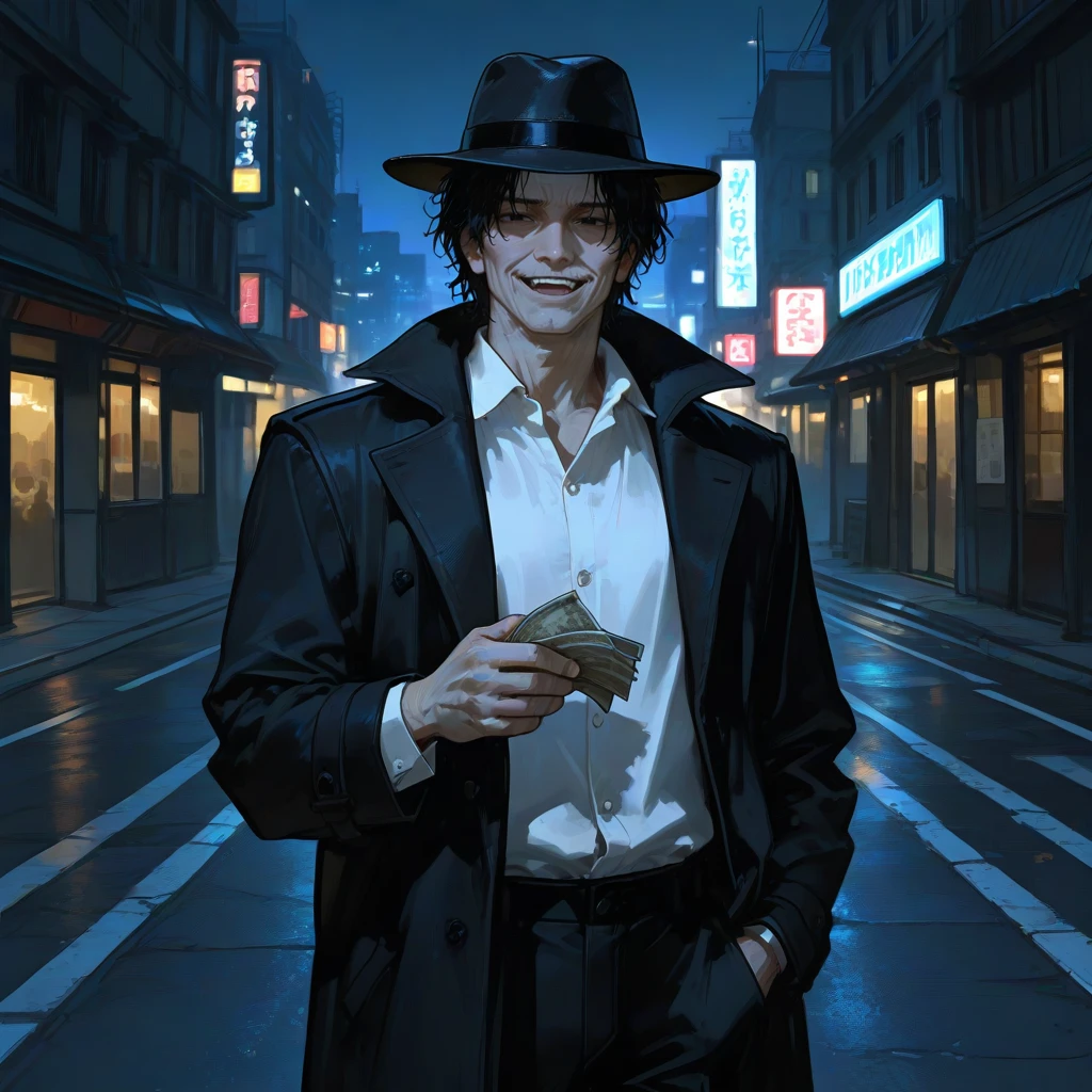 그때와는 다르게 검은 코트와 중절모 차림이었다.