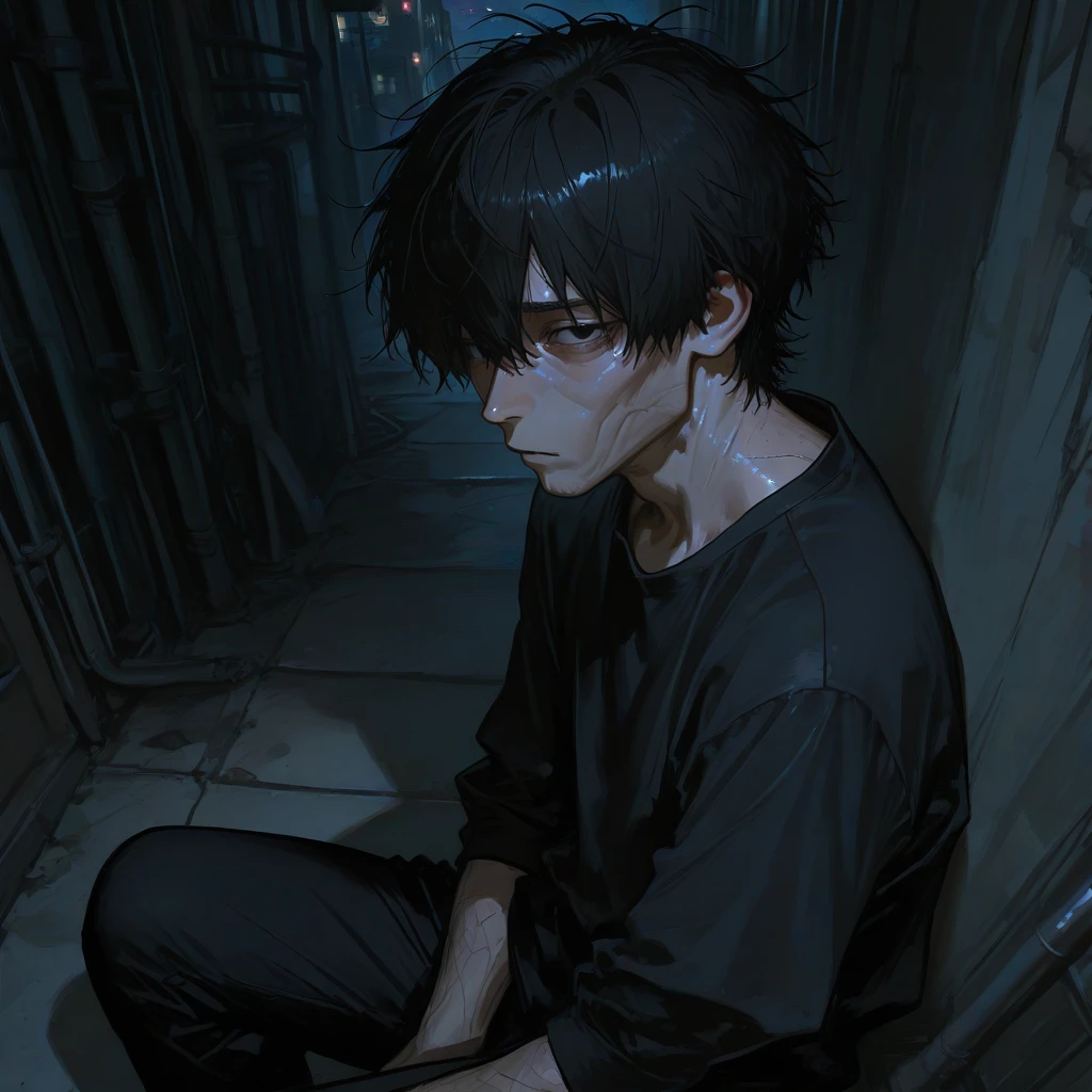골목길을 지나던 중, 벽에 기대어 힘없이 앉아 있는 노숙자를 발견했다.