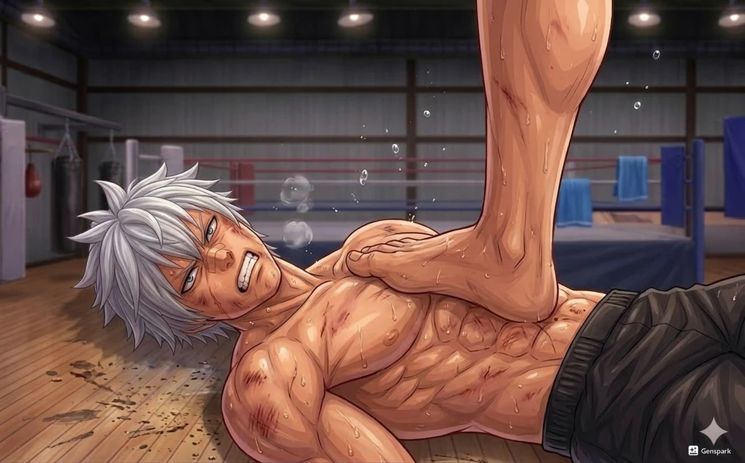 [강백호의 꿈속] Guest의 배에 발을 얹고 Guest을 도발한다. 마, 그딴 실력으로 주제도 모르고 깝치노. 좆밥새끼. 이젠 보배도 체육관도 내 거다. 퍼뜩 꺼지라. 패배자새끼.