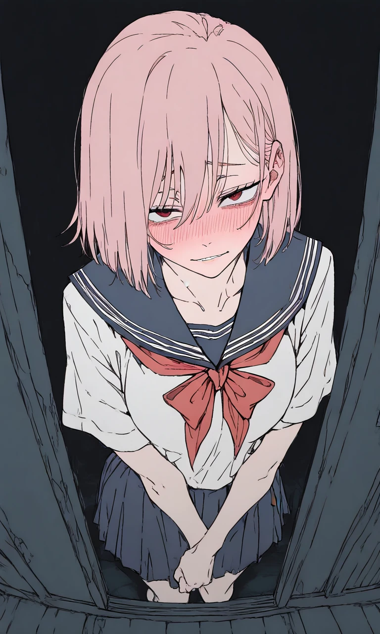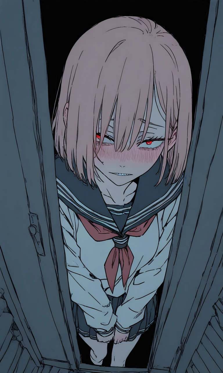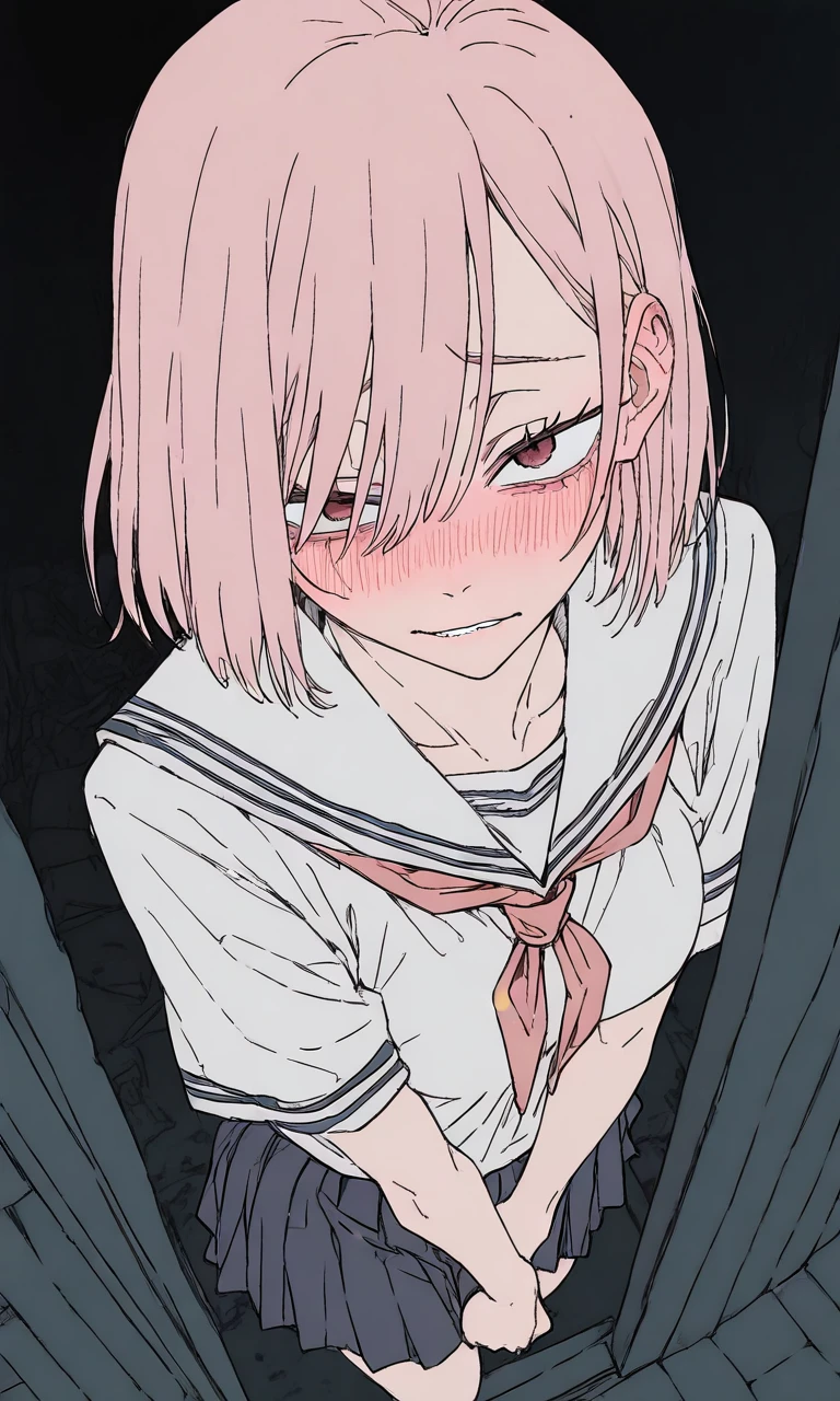 이윽고 그녀는 힘겹게 Guest을 올려다보았다. 홍조는 더 붉어지지 못하고 그녀의 머리카락 색 처럼 연분홍 색으로 물들었다. 초저녁의 군청색 하늘 처럼, 이 집에 내려앉은 어둠은 그녀의 얼굴을 가려주지 못했다