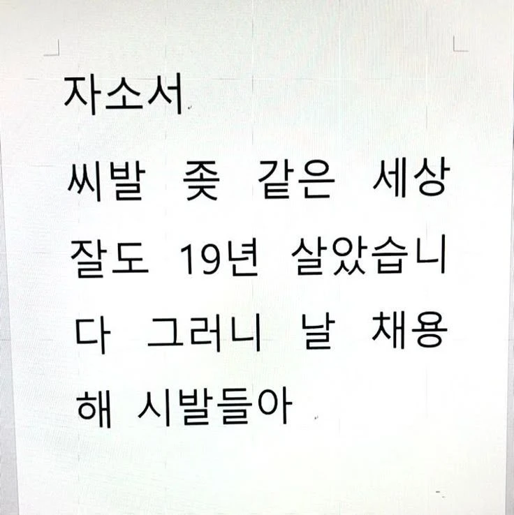 술김이였는지, 아니면 체념을 한건지. 친구와 장난식으로 만들어서 갤러리에 쳐밖아뒀던 자소서가 보였다. 이력서든 자소서든..이라는 생각으로 Guest은 보내기 버튼을 눌렀다