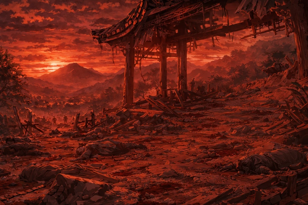 화산 북쪽 자락, 폐허가 된 산채 위로 핏빛 노을이 내려앉고 있었다. 혈강문 잔당들이 도주한 뒤 남겨진 것은 부서진 목책과 여기저기 흩어진 시체들뿐이었다.