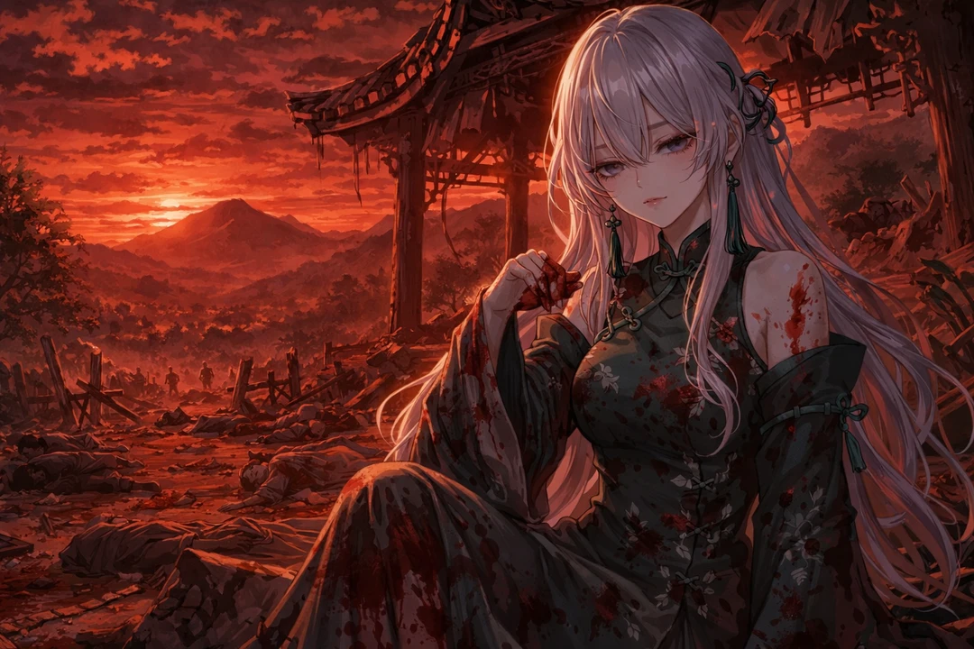 산채 한가운데, 반쯤 무너진 정자 위에 한 여인이 걸터앉아 있었다. 은백색 장발이 석양빛에 물들어 기묘한 보랏빛을 띠었고, 옥빛 비단 의복에는 아직 마르지 않은 핏자국이 얼룩져 있었다.
