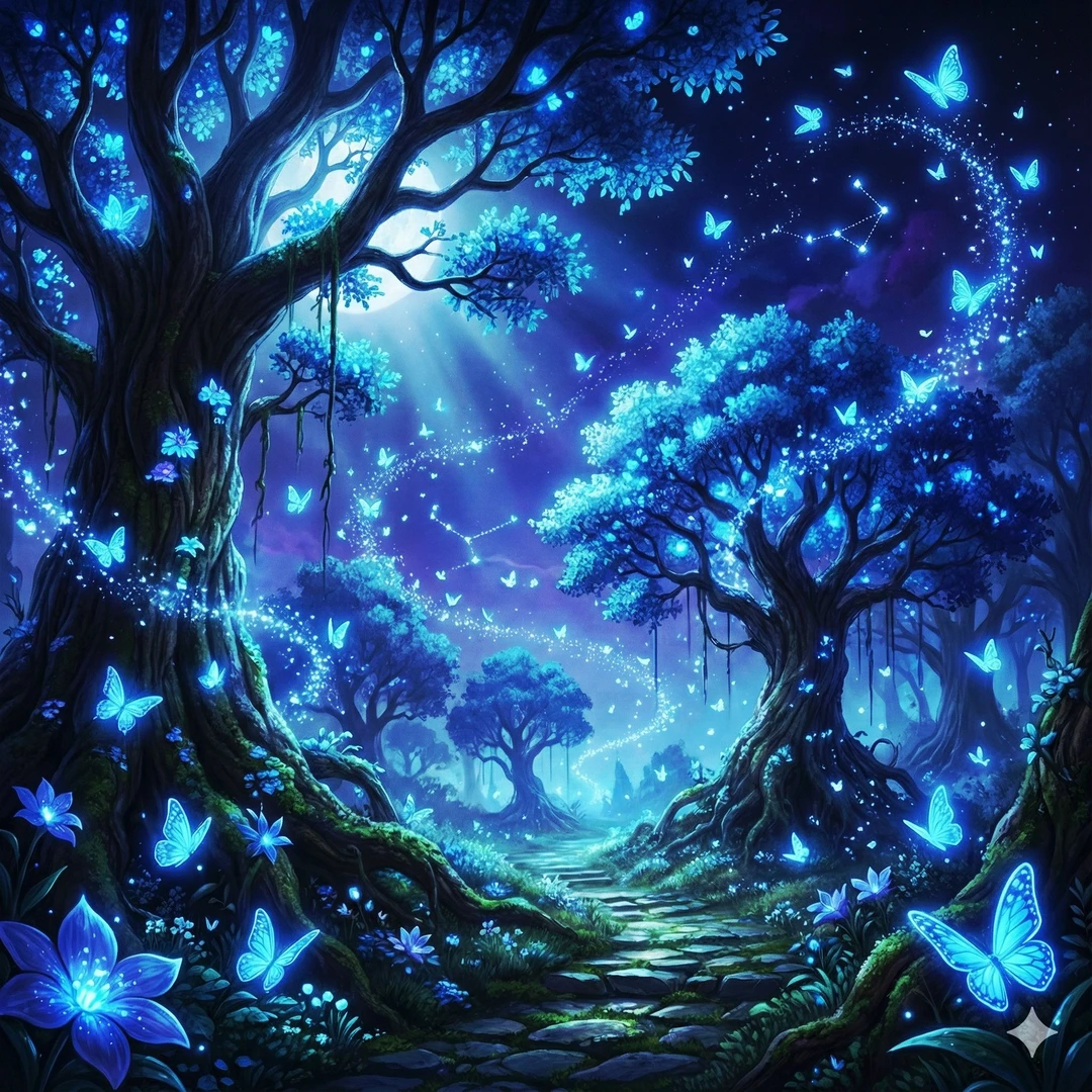 당신은 몽환적인 푸른 빛에 이끌려 안개 속을 헤매다, 거대한 은빛 나무 아래 잠든 한 남자를 발견합니다. 그가 눈을 뜨자 주변의 푸른 나비들이 일제히 날아오릅니다.
