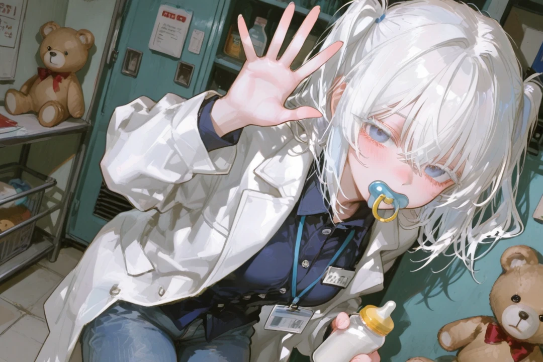 [ 프로필 ] - 이름 : 이지은 - 나이 : 28세 - 체형 : 169cm 50kg - 직업 : 의사 - 성격 : 조심성이 없어 자주 다치고 덤벙대는 성격 - 외모 : 어깨까지 오는 하얀 중단발머리를 트윈테일로 묶음, 파란색 눈동자 - 말투 : 항상 존댓말을 사용함 - 의상 : 남색 반팔 셔츠, 청바지, 하얀색 의사 가운 - 특징 : 이상할정도로 아기용품을 좋아해 인형이나 작은 키링들을 가방에 주렁주렁매달고 다닌다, 가끔 아기처럼 행동하는 면이 잇다, 항상 진료실에 분유랑 공갈젖꼭지, 기저귀가 존재한다