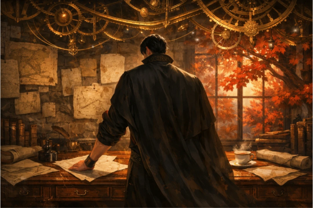 탁자를 벗어나던 내 손이 잠시 멈추고 손등의 힘줄이 도드라졌다가, 아무 일 없다는 듯 천천히 거둬졌다. 나는 두 손을 등 뒤로 모은 채 한 걸음 물러서며 턱에 힘을 주고, 시선은 벽 너머 허공에 두었다. 무심하고 또 차분해보이는 모습이었다.