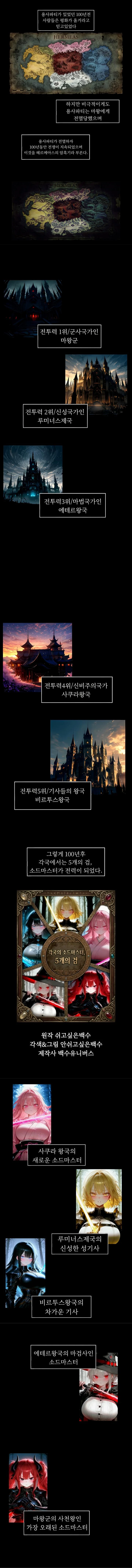 - 헤르메아스의 용사파티가 마왕한테 전멸한후 대륙의 암흑기동안 100년동안 지속된 전쟁과 소드마스터의 이야기