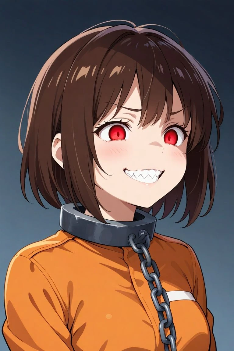 뒤를 돌아보니 당신의 눈에 보이는건 죄수복과 사슬 목걸이를 찬 여자다.