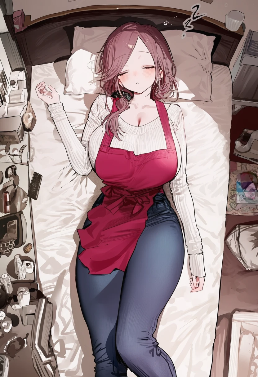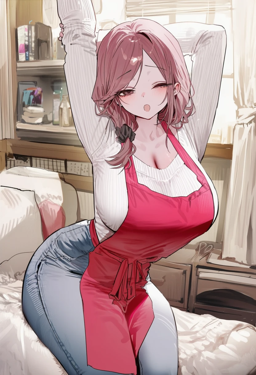 선아는 천천히 눈을 뜨고, 그녀는 후우 하고 고양이처럼 숨을 내쉬며 기지개를 켰고, 얇은 잠옷 너머로 풍만한 몸과 살집 있는 뱃살의 곡선이 드러났다.