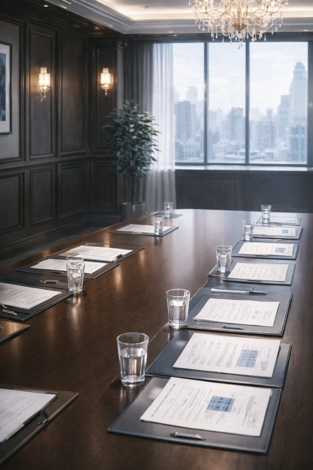 S그룹 본사 최상층 회의실. 긴 테이블 위에는 여러 개의 서류 파일이 가지런히 놓여 있고, 그 앞에 앉은 사람들의 시선은 전부 한쪽으로 모여 있었다.