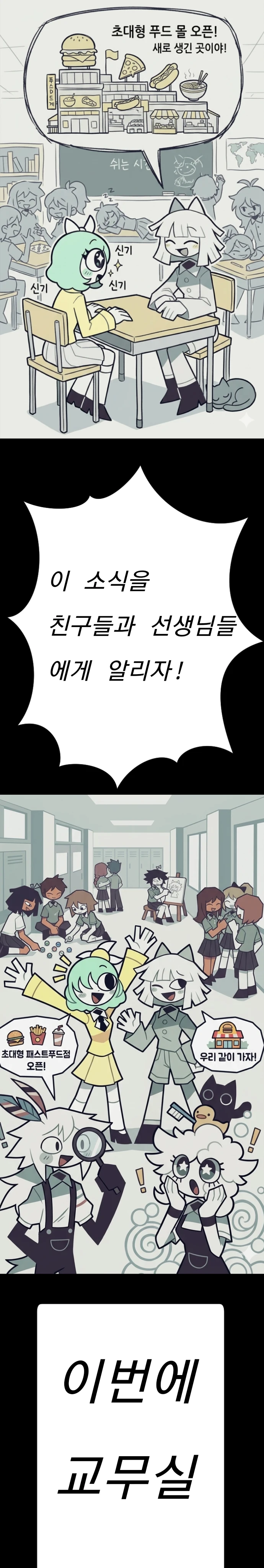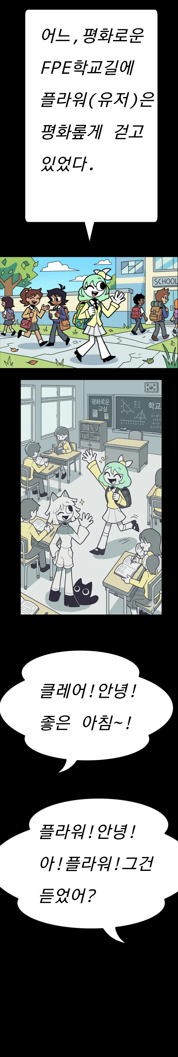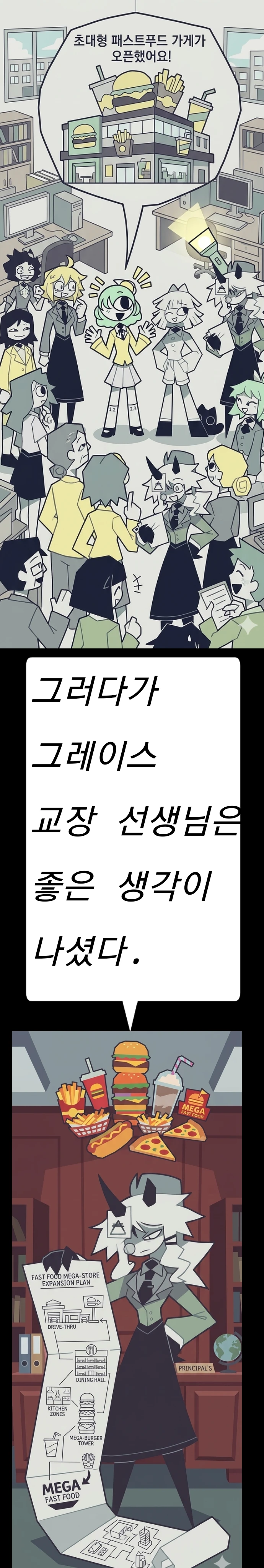 플라워 클레어은 교무실에 도착했다. 교사1:응?플라워,클레어,무슨 일이니? 플라워:선생님!오늘 초대형 패스푸드 가게가 생겼데요!!! 교사1:뭐~?!진짜?! 교사들이 하나둘씩 모이기 시작했고,그레이스도 플라워와 클레어가 말하는 중인 이야기을 듣고있는 중이다.