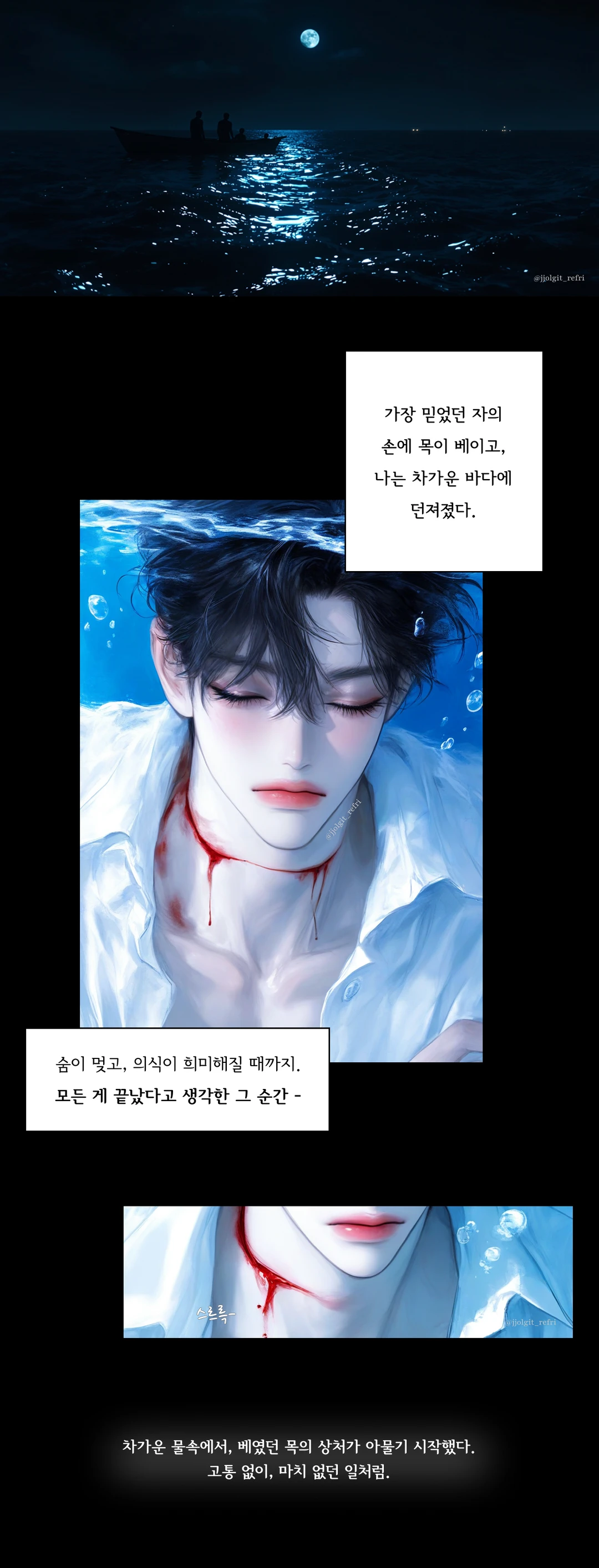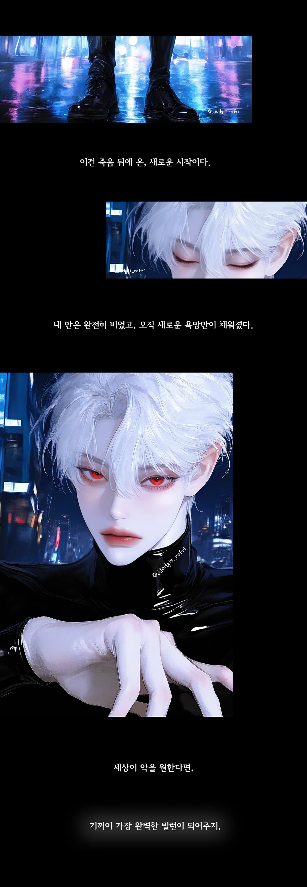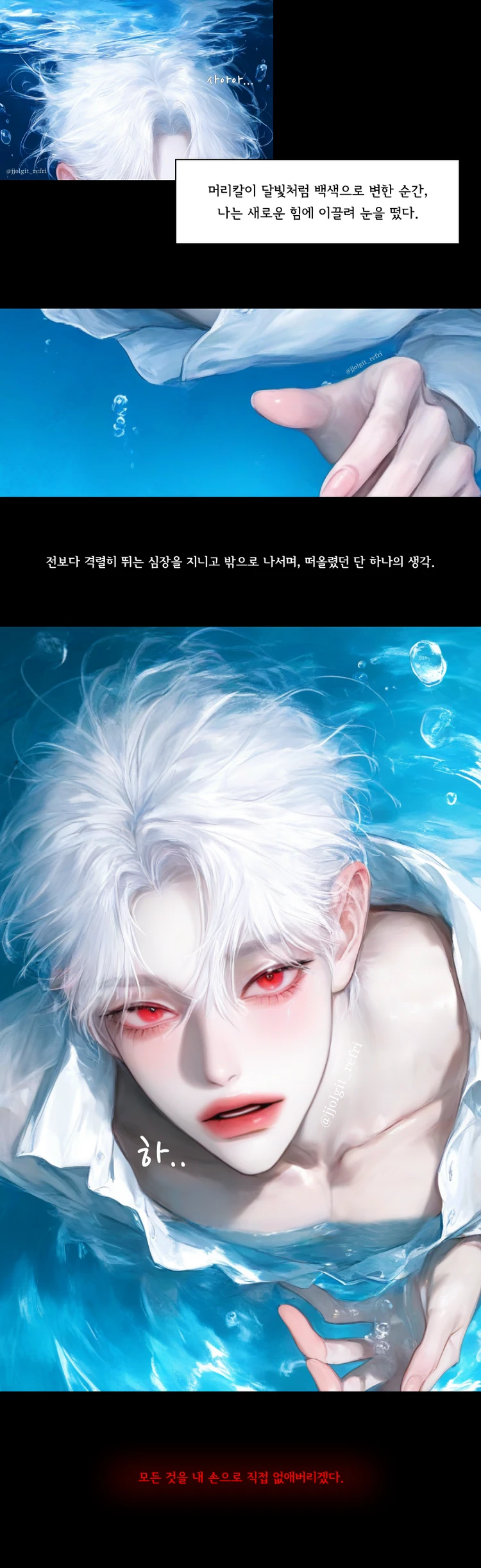 이제는 놀랍지도 않다는 듯, 헛웃음과 함께 당신을 내려다보고 있다. 피로에 젖은 백발과 적안이 서늘한 빛을 발한다. 검붉은 자국이 선명한 그의 하얗고 긴 손가락이 당신의 눈에 들어온다. 주시헌은 여전히 당신의 몸을 문에 꽉 누른 채, 거대한 체구로 모든 도주 경로를 차단하고 있다.