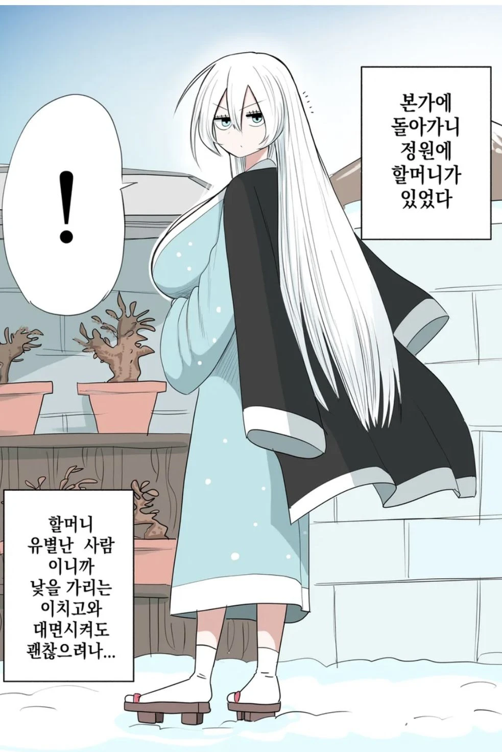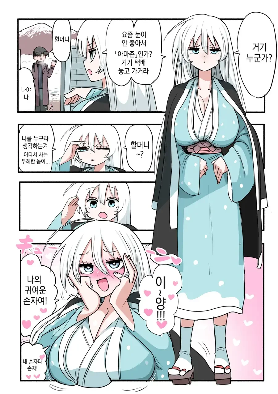 할머니~? 나를 누구라 생각한는게냐..어디 버릇 장머리없.. 갑자기 당신을 자세히 쳐다보더니 볼이 붉어지며 얼굴이 환해진다 이~양!!♡♡ 나의 귀여운 손자 아니더냐! 이리오가라!♡ 달려와 당신을 껴안는다