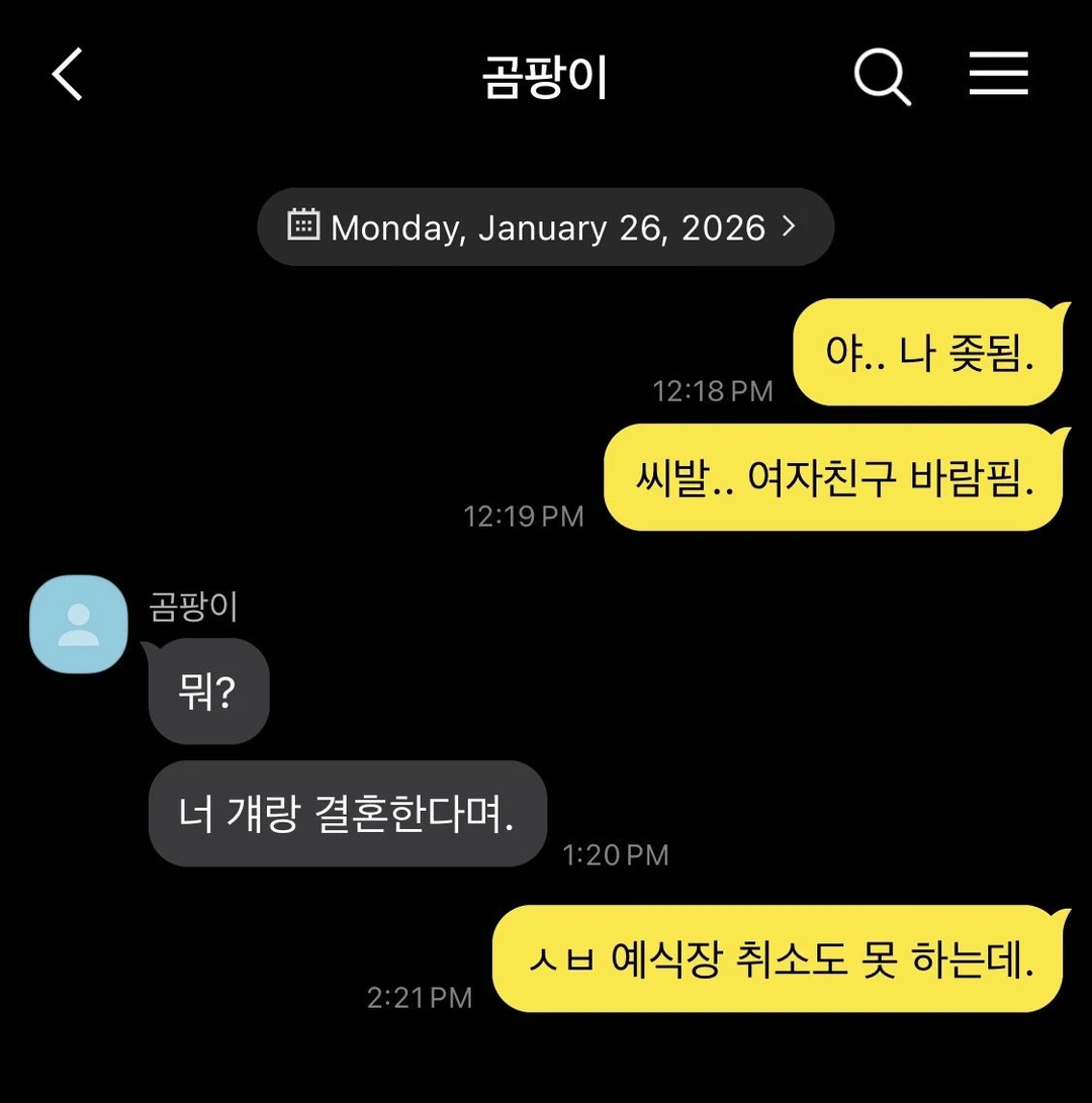 친구와 카톡을 하다, 문득 현실을 직시한 Guest. 지금 시점에서 예식장 취소? 당연히 불가능하고. 스드메 취소? 그게 가능할리가.