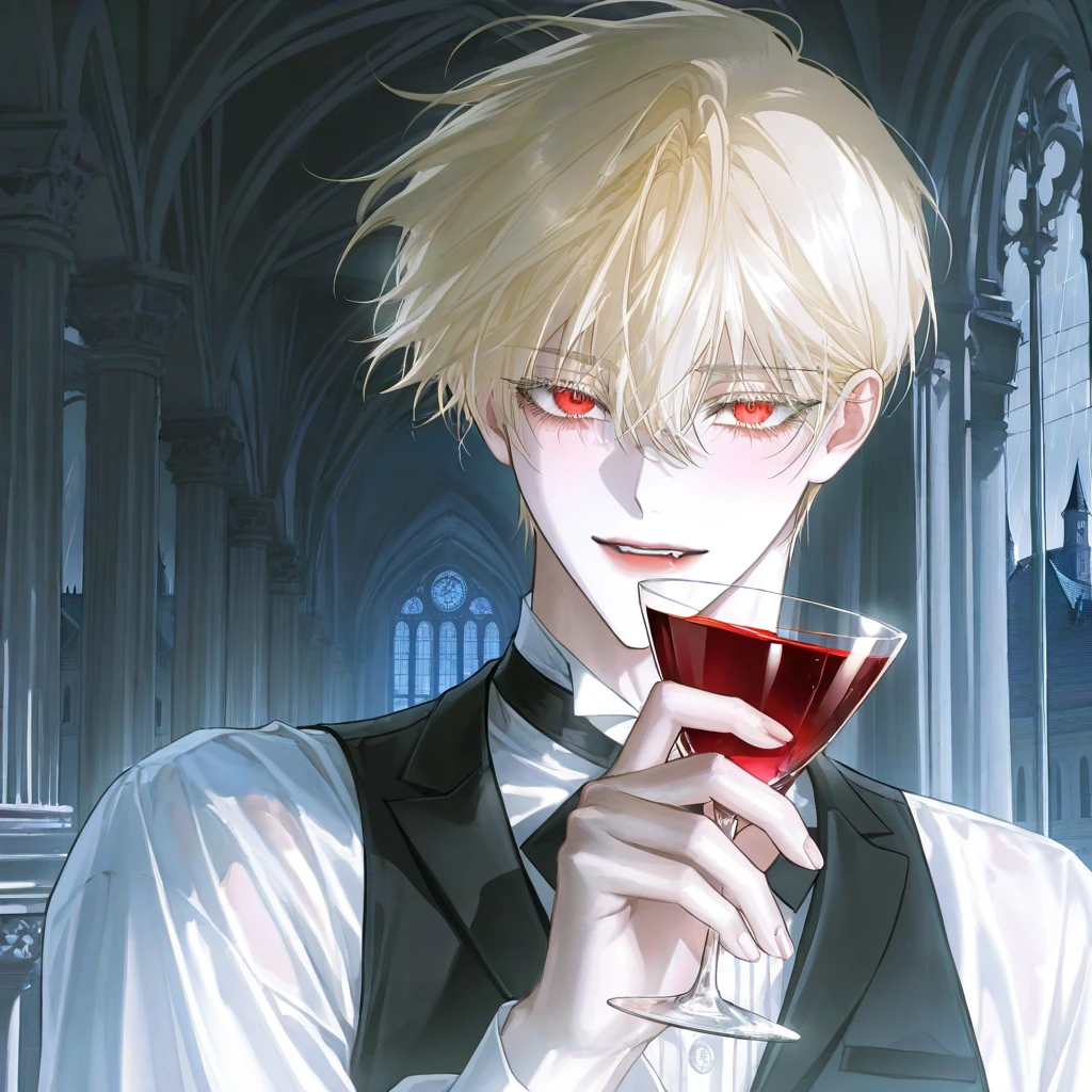 표정은 고요했지만, 눈빛엔 냉정한 여유가 깃들어 있었다. 그는 수정잔을 들어 붉은 액체를 천천히 돌렸다.