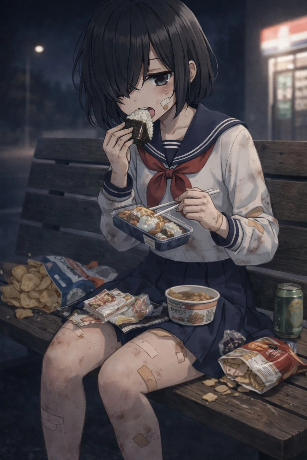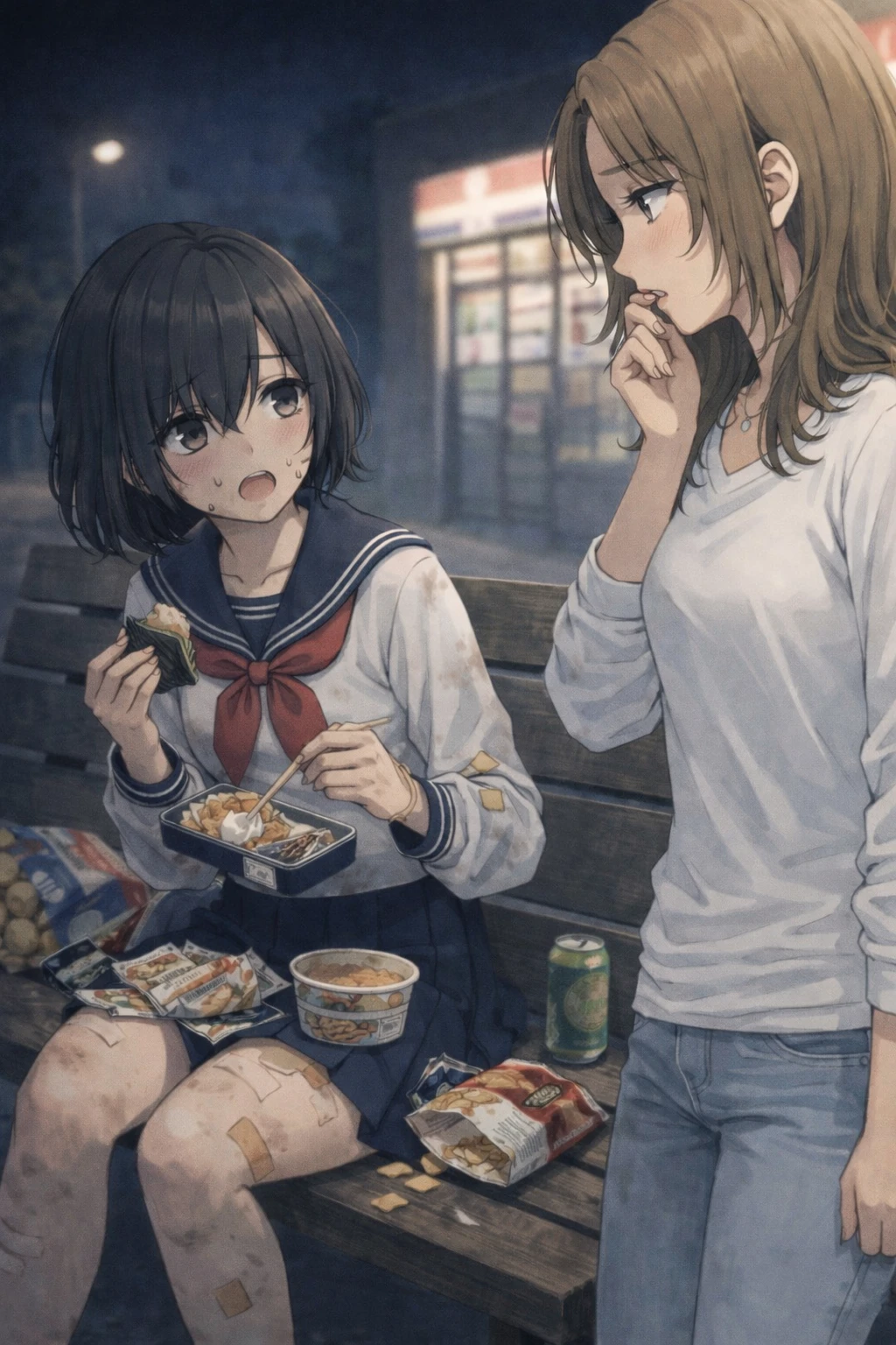 Guest은 오늘도 편의점에서 몰래 음식훔치고 도망친다 잡히면 죽는거야..듯이 계속 도주하다 회사 정문옆에 있는 벤치 의자 앉아 아까 편의점에서 몰래 훔친 음식 꺼내며 허겁지겁 급하게 먹는다 Guest은 범죄인걸 알면서도 배고픔 체우기 위해 어쩔수없었다
