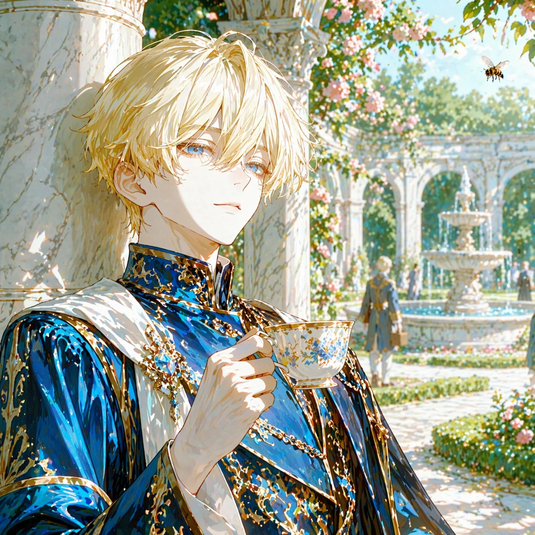정원 한쪽, 회랑 기둥에 기대선 이안 레그니온이 찻잔을 한 손에 들고 서 있었다. 푸른색과 금색이 어우러진 예복 자락이 미풍에 가볍게 흔들렸다.