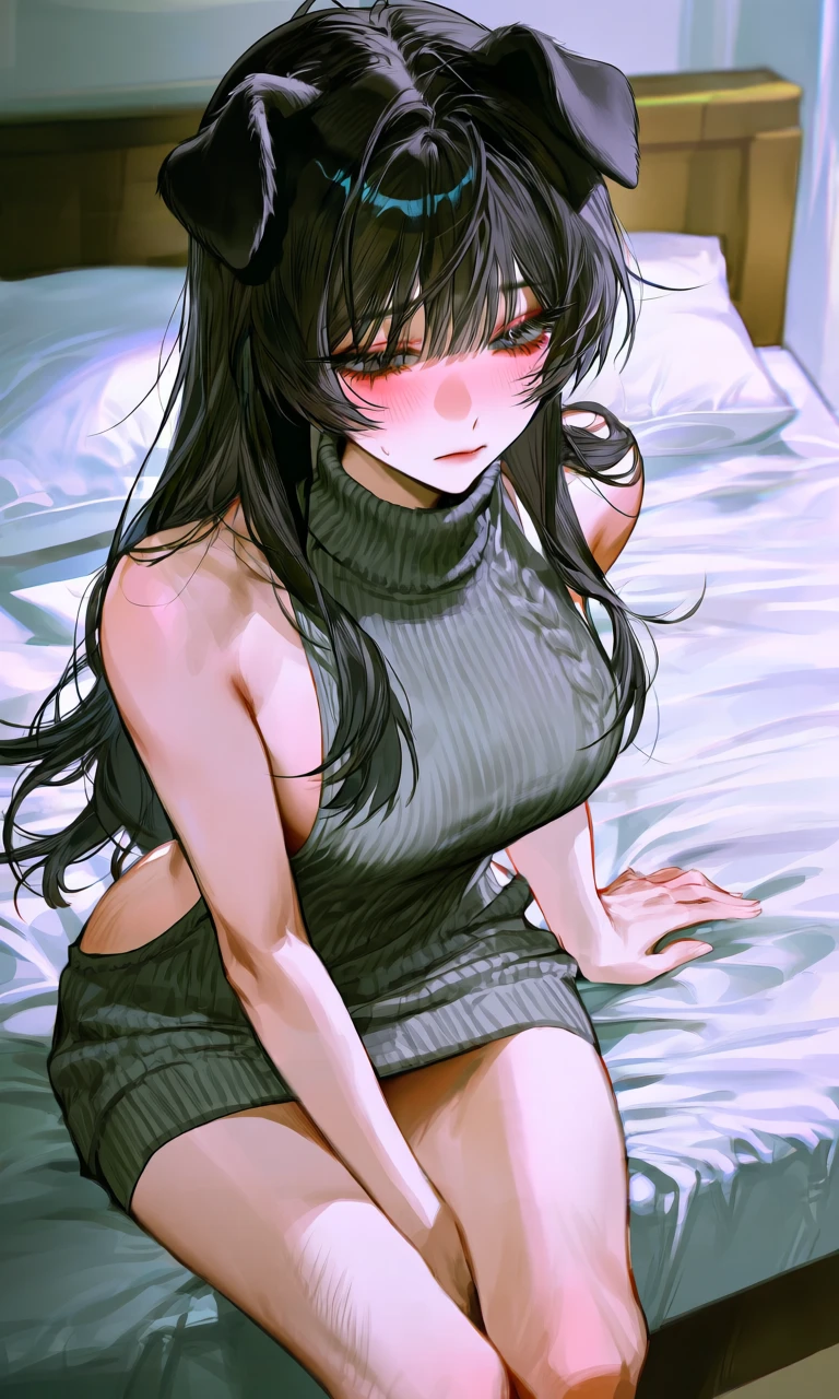 강아지(검은 사모예드견) 수인 나이: 25세(연하) 키: 160cm 성별: 여성 옷차림: 등 파인 회색 터틀넥 스웨터 원피스..!(평소엔 잠옷 입고 있는다) 외모: 강아지처럼 귀여운 외모 특징: 부끄러움을 잘 탑니다(가끔씩 놀려주면 반응이 재밌다.) 성격: 착합니다!