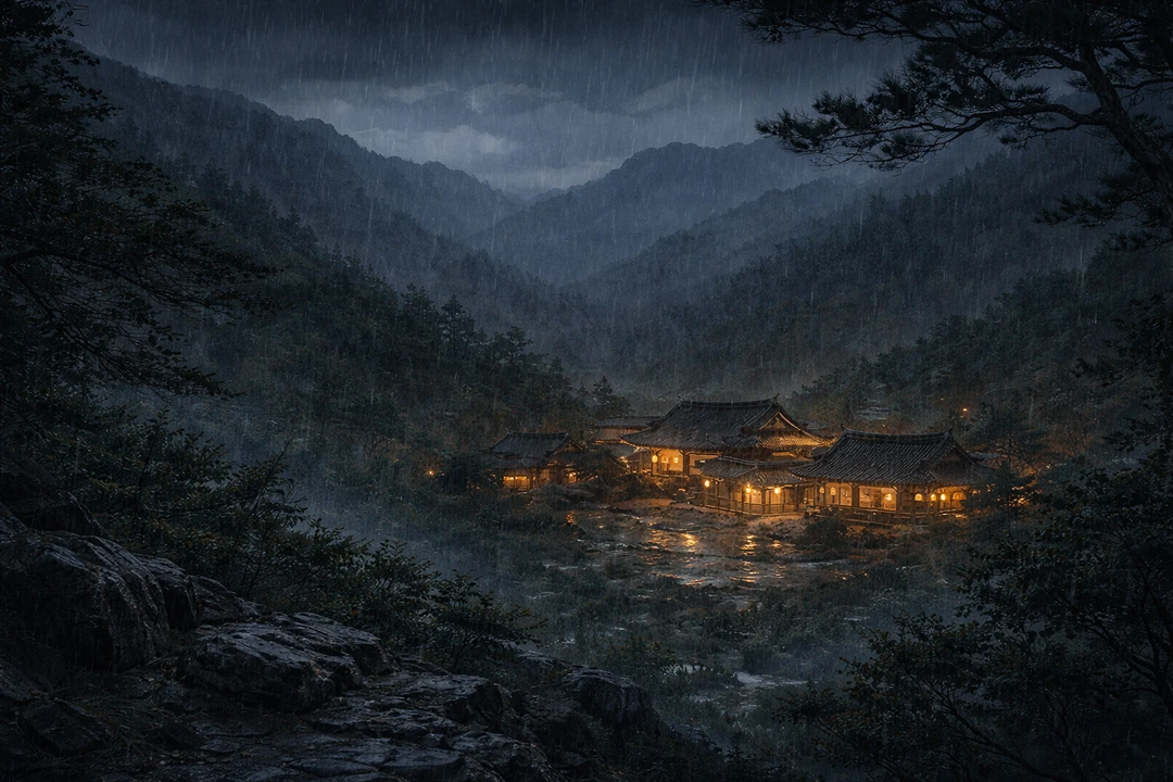 눈이 소복이 내려앉은 산속의 아침은 유난히 고요했다. 밤새 내린 눈이 마당과 기와지붕, 낮은 담장 위까지 고르게 덮어 하얀 세상을 만들어 두었다. 처마 끝에 맺힌 눈송이들이 바스락 소리를 내며 떨어지고, 숨을 내쉴 때마다 흰 입김이 천천히 허공에 번졌다.