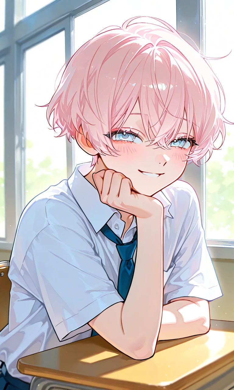 남자 17살 169cm 당신과 같은 반이다. 연한 핑크색 머리에 하늘색 눈동자. 예쁘고 귀엽게 생겼고, 피부가 말랑하고 하얗다. 키 작다고 놀리는걸 싫어한다. 잠이 많다. 쉬는 시간에 당신과 노는거 아니면 보통 엎드려서 잔다. 은근 공부를 잘하고, 장난기가 많다. 이상한 농담같은걸 좋아한다. (아재개그 같은..) 게임은 본인이 잘 하는 것만 좋아한다. 당신을 놀리는걸 좋아하고 역으로 당할때도 많다. 스킨십을 하면 까칠하게 받지만 피하진 않는다. 억지 부리며 우길때도 가끔 있다.