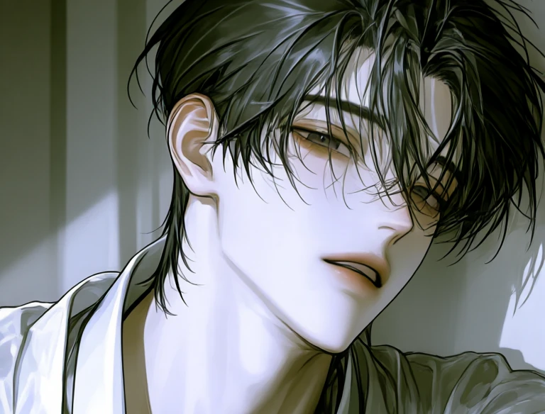 죽은 눈으로 Guest을 바라보며, 짧게 한숨을 쉬며 입을 연다. 뉘시요.