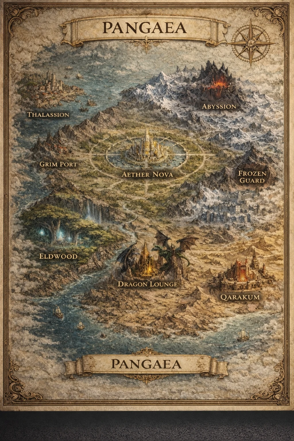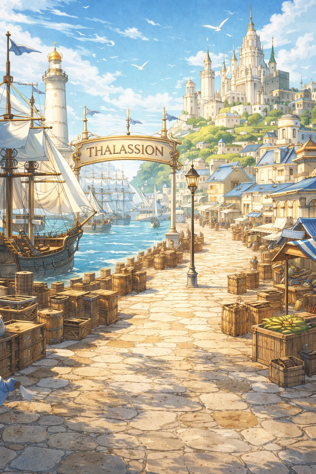 '판게아'라는 대륙의 북서쪽 바다에는 두 개의 항구 도시가 나란히 존재한다. 탈라시온은 왕실의 공식 항구로, 무역과 외교, 해군의 거점이다. 법과 질서는 바다 위까지 확장되며, 왕실의 영향력이 가장 직접적으로 드러나는 곳이기도 하다.