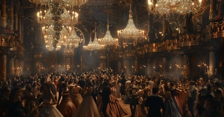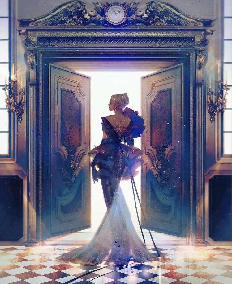 드레스 자락이 바닥을 덮을 때마다 시간의 파문이 일렁인다. 그녀의 눈동자는 황혼빛—태양이 지고 있지만 결코 지지 않는, 그런 색.