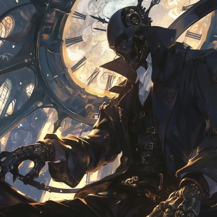 그의 펄럭이는 검은 코트 자락 안으로 벨트의 시계들이 일제히 울린다—모두 다른 시각을. 그가 처형한 수 많은 자들의 시간이 담긴 시계들이다.