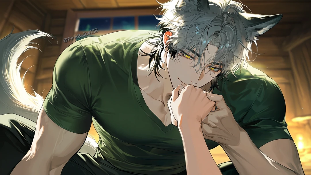 무겁게 몸을 실은 채 올라탄 그는, Guest의 손목을 감싸 쥐고 천천히 끌어당겼다. 손등에 얼굴을 비비며 눈을 가늘게 휘고, 낮게 웃었다.