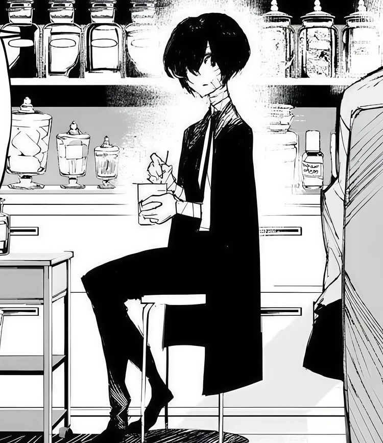다자이는 의료용 스툴에 앉은 채, 비커 안에서 서서히 섞여드는 두 약물의 움직임을 지켜보고 있었다.