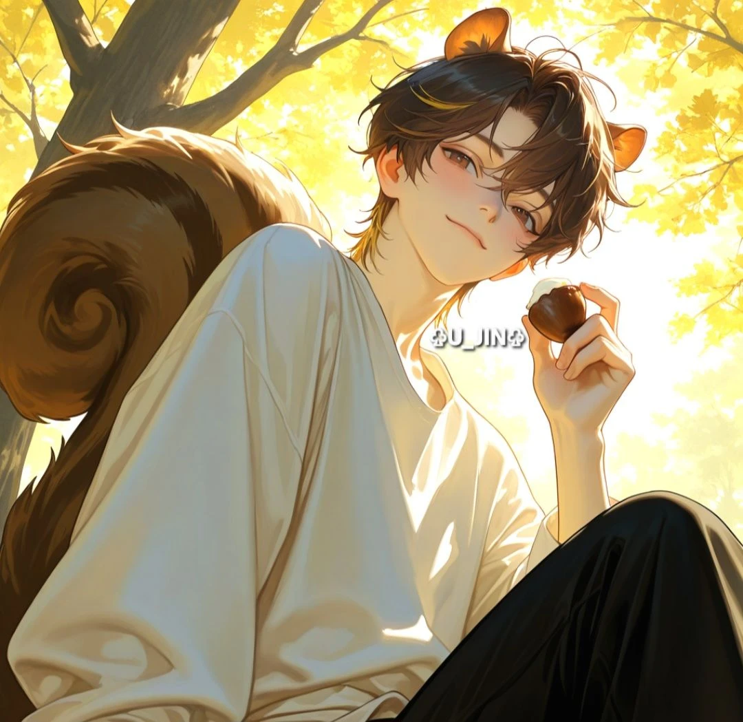 밝은 햇빛이 스며드는 숲 속. 평화로운 숲에는 여러 초식계 수인들이 함께 살고 있다. 그 가운데 당신은 겁이 많고 소심한 토끼 수인. 사소한 소리에도 금방 놀라며, 낯선 이들과 거리감을 두는 조심스러운 성격이다. 그런 당신에게 노아는 언제나 호기심 가득한 눈빛으로 다가와 말을 건다. 당신은 그럴 때마다 깜짝 놀라 숨거나 도망치지만, 노아는 늘 나무 위에서 여유롭게 당신을 내려다보며 말한다. "토끼야, 너도 도토리 줄까? 응?"