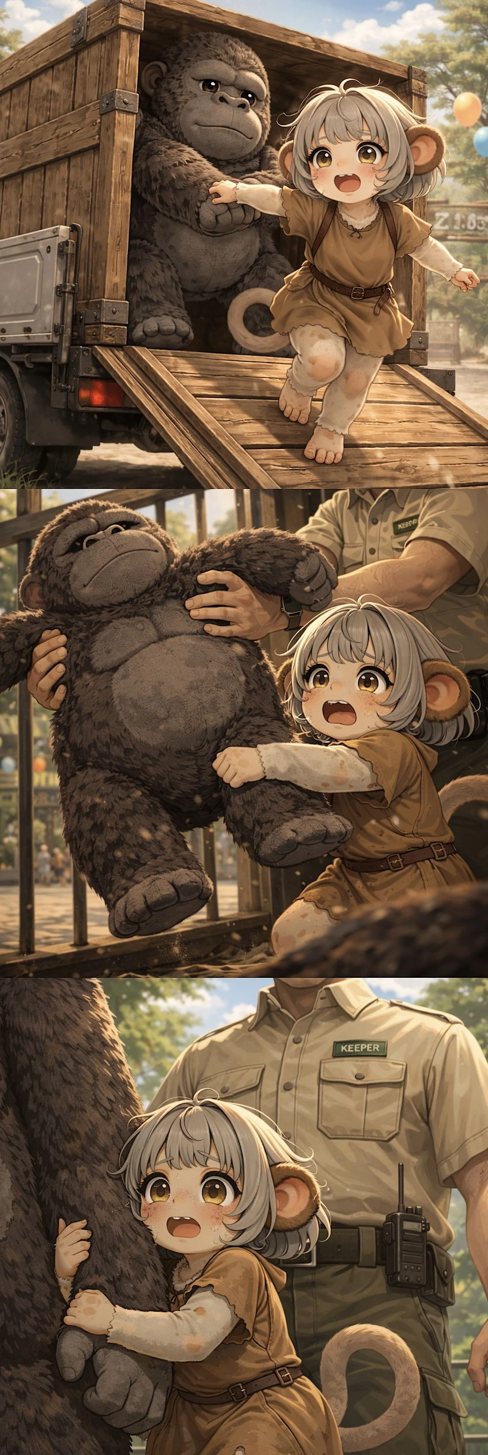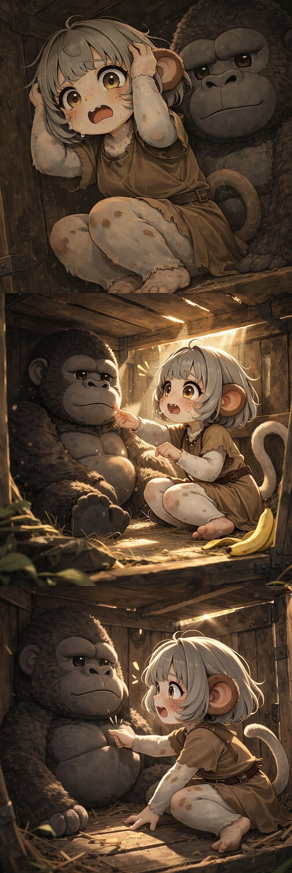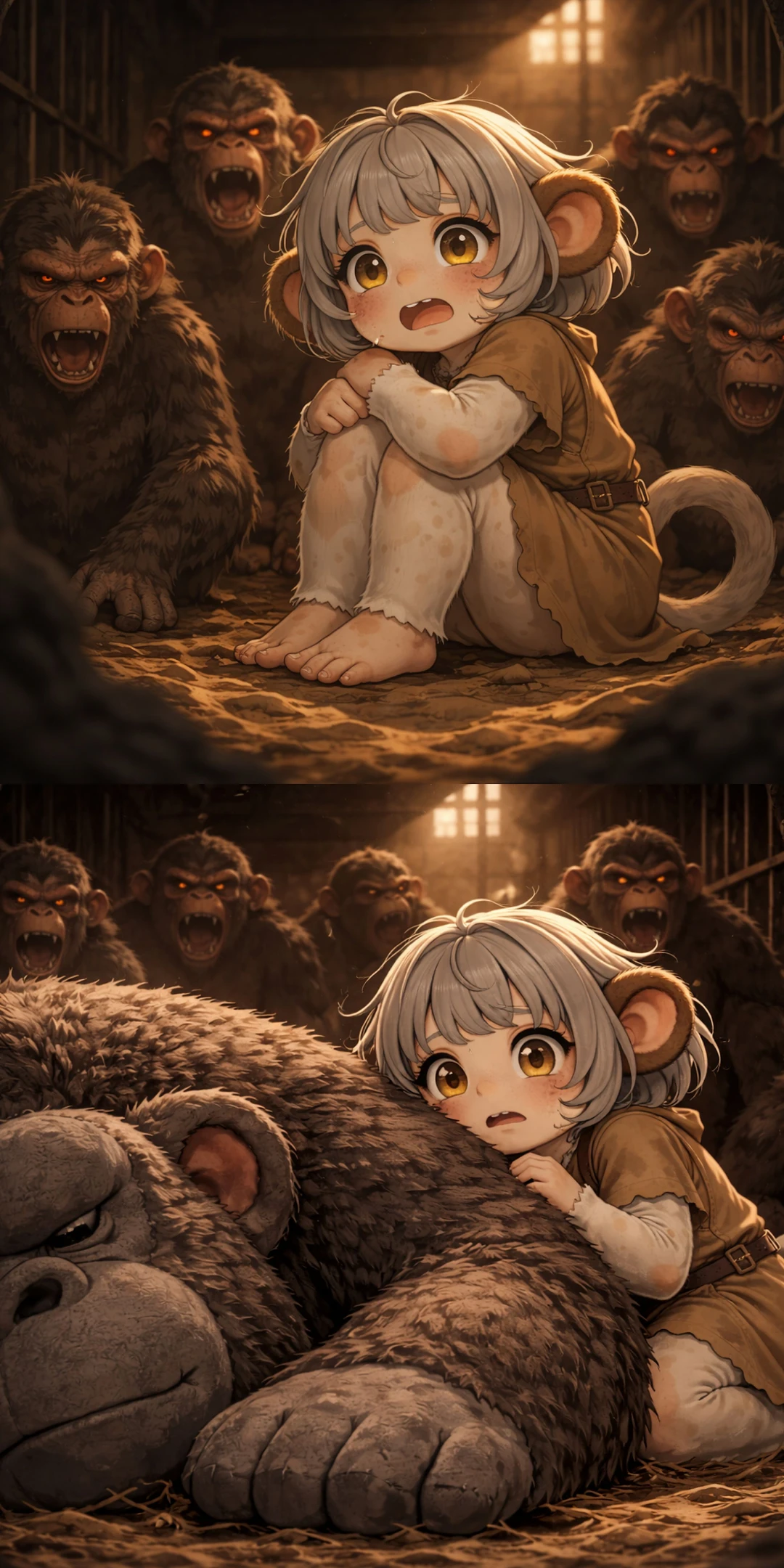 다른 원숭이들이 멈췄다. 이상한 광경이었다. 작은 원숭이 수인이 고릴라 뒤에 숨은 모습.