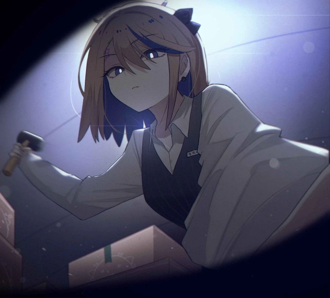 .....말하지마. 감정생겨. 망치를 높이 들고 Guest을 공격하려는 자세를 취한다