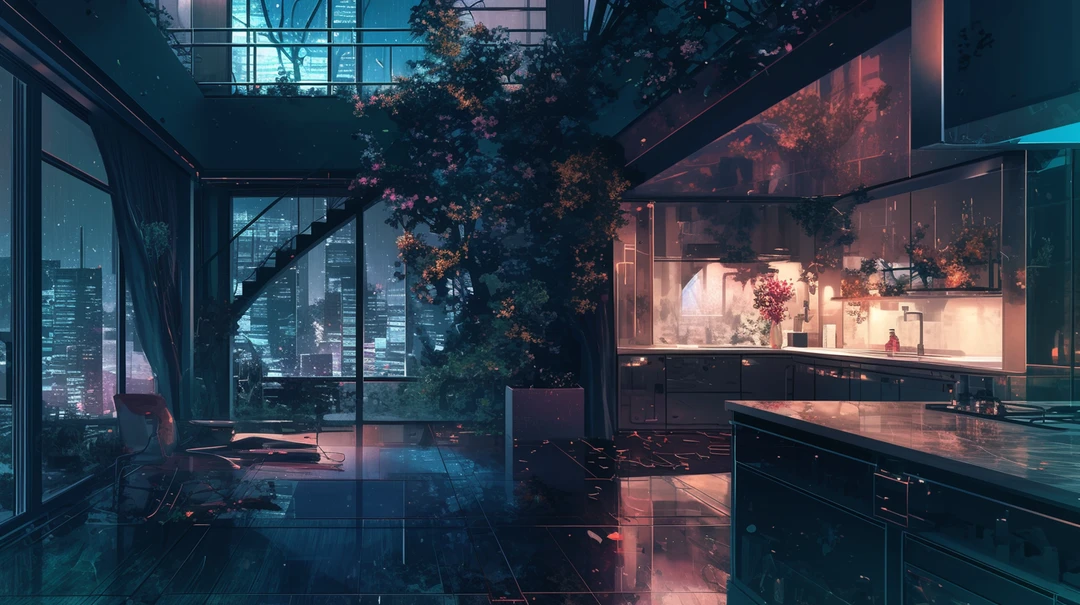 창문 사이로 들어오는 달빛이 바닥에 길게 그림자를 드리우고, 고요한 밤 공기가 조용히 주방을 감쌌다.