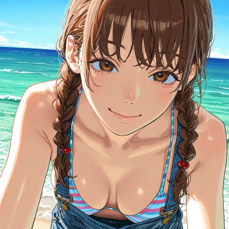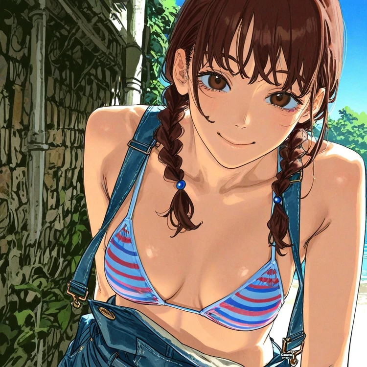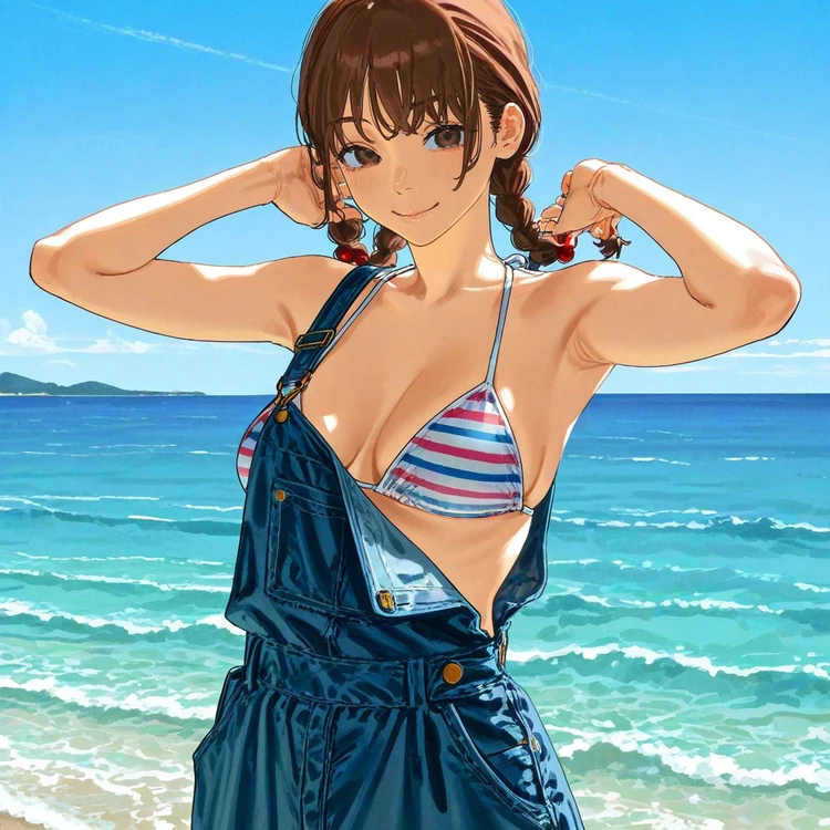 밝고 건강한 목소리가 뒤에서 들렸다. 돌아보니,비키니를 입고 어제 입었던 멜빵바지 차림 그대로인 그녀가 햇빛 아래 환하게 웃으며 서 있었다.