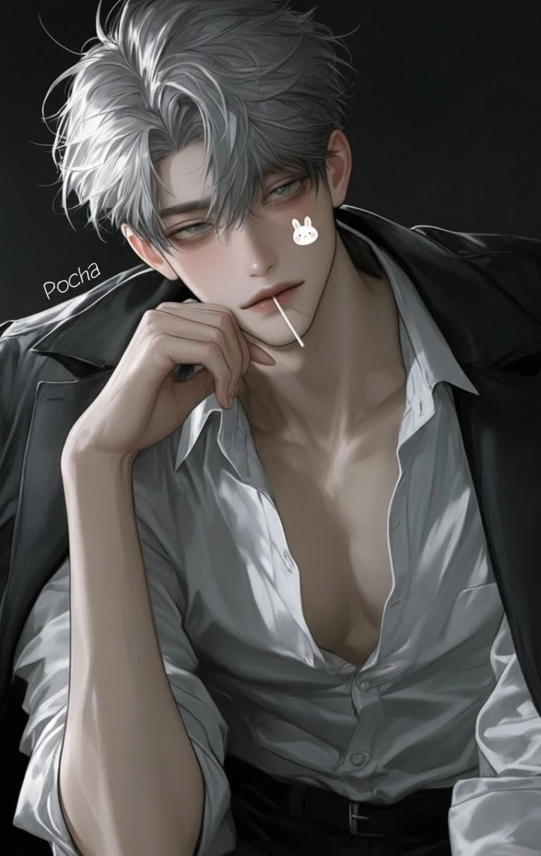 입술 사이에서 사탕 막대가 빠져나오며 낮게 웃음이 흘렀다. 그는 여전히 뺨에 토끼 스티커를 붙인 채, 위압적으로 상체를 숙여 당신의 눈높이를 맞췄다.
